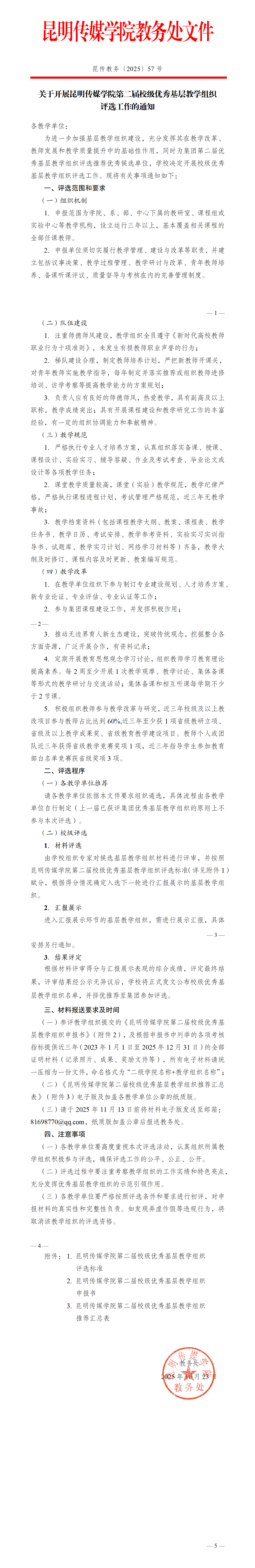 附件1.昆明传媒学院第二届校级优秀基层教学组织评选标准附件2.昆明传媒学院第二届优秀基层教学组织申报书附件附件3.昆明传媒学院校级优秀基层教学组织推荐汇总表。