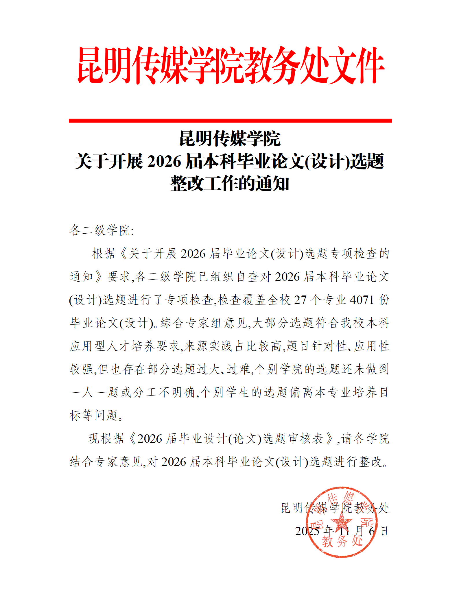 昆明传媒学院关于开展2026届本科毕业论文(设计)选题整改工作的通知