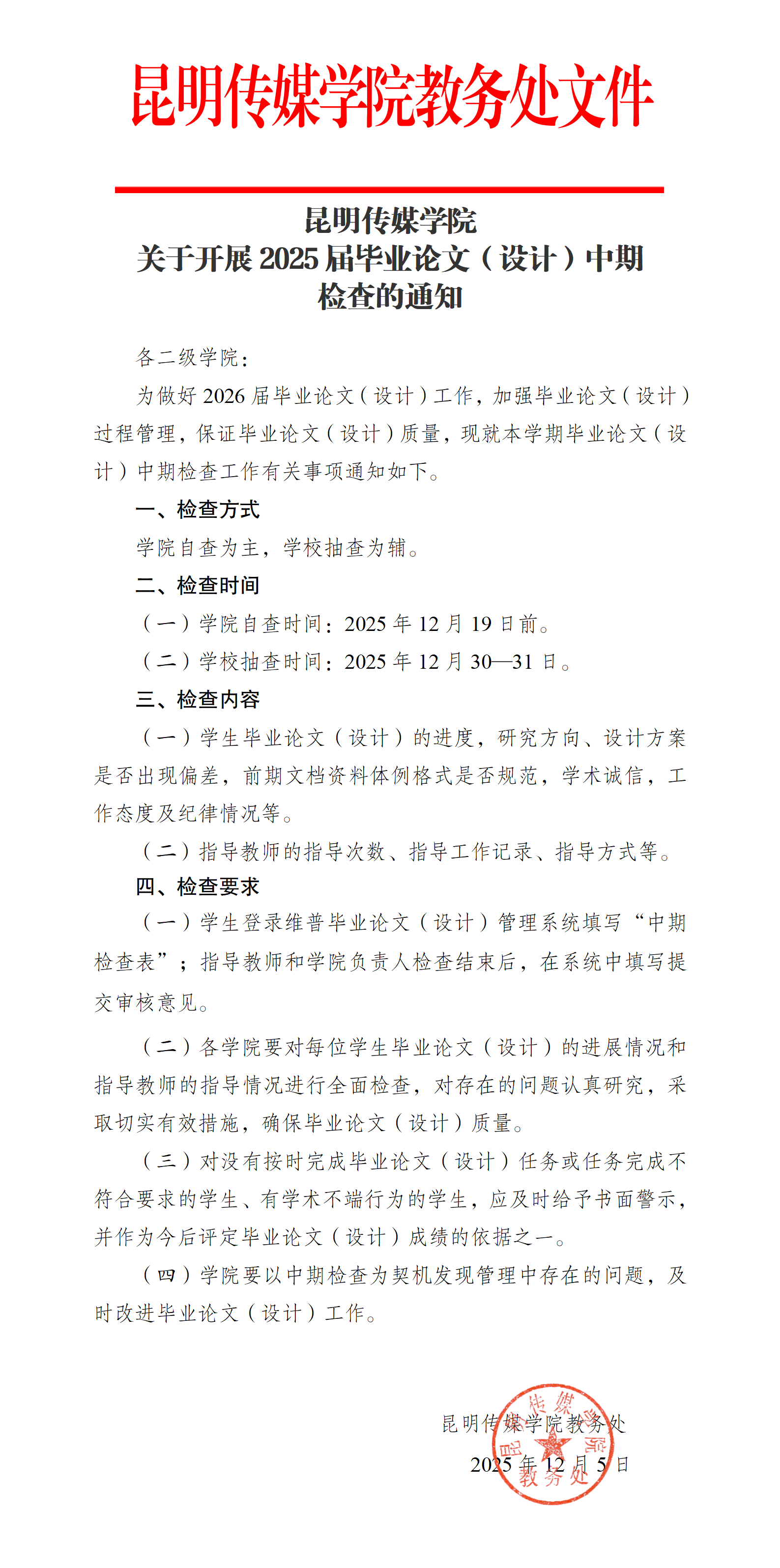昆明传媒学院关于开展2025届毕业论文(设计)中期检查的通知
