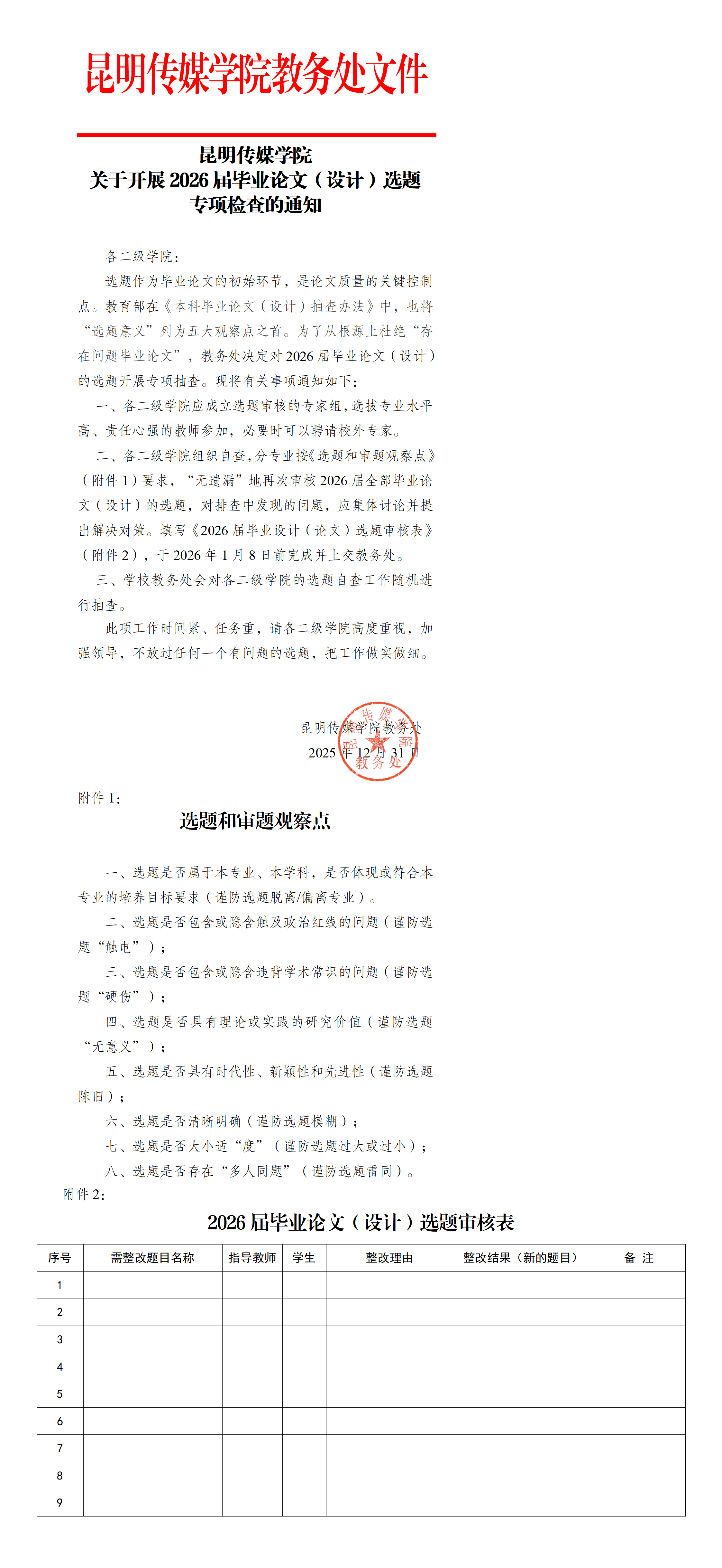 昆明传媒学院关于开展2026届毕业论文(设计)选题专项检查的通知