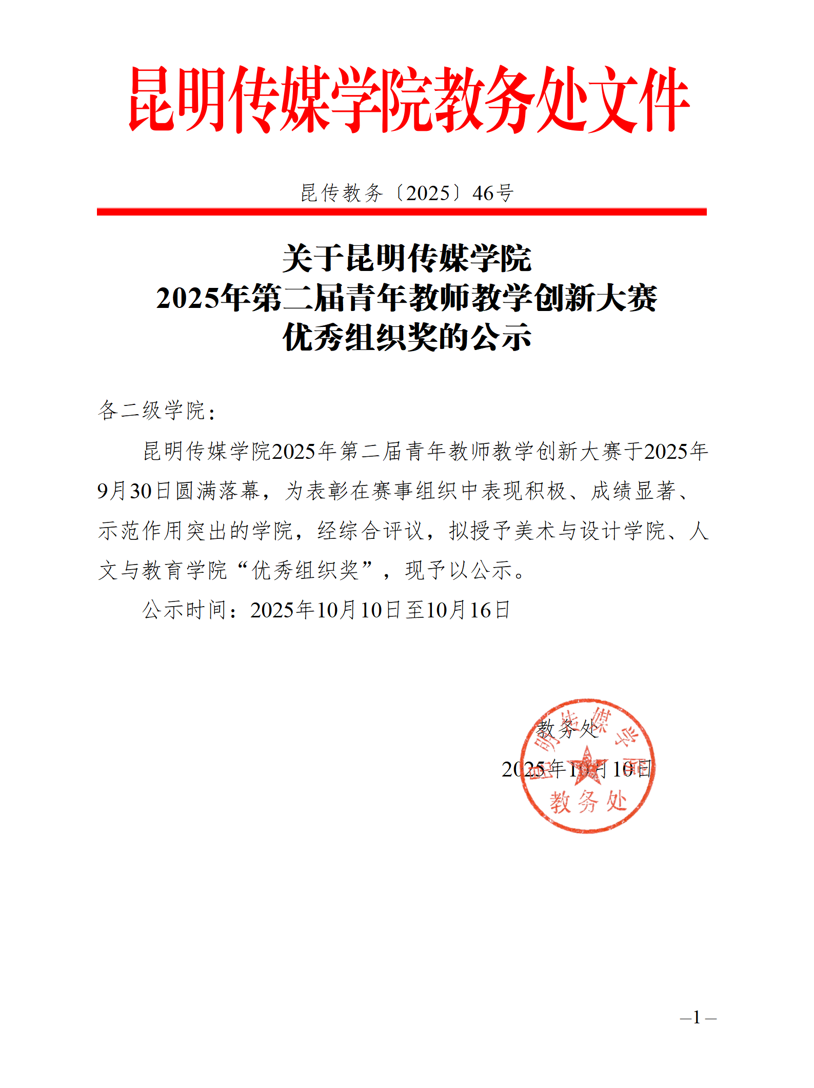 关于昆明传媒学院 2025年第二届青年教师教学创新大赛 优秀组织奖的公示
