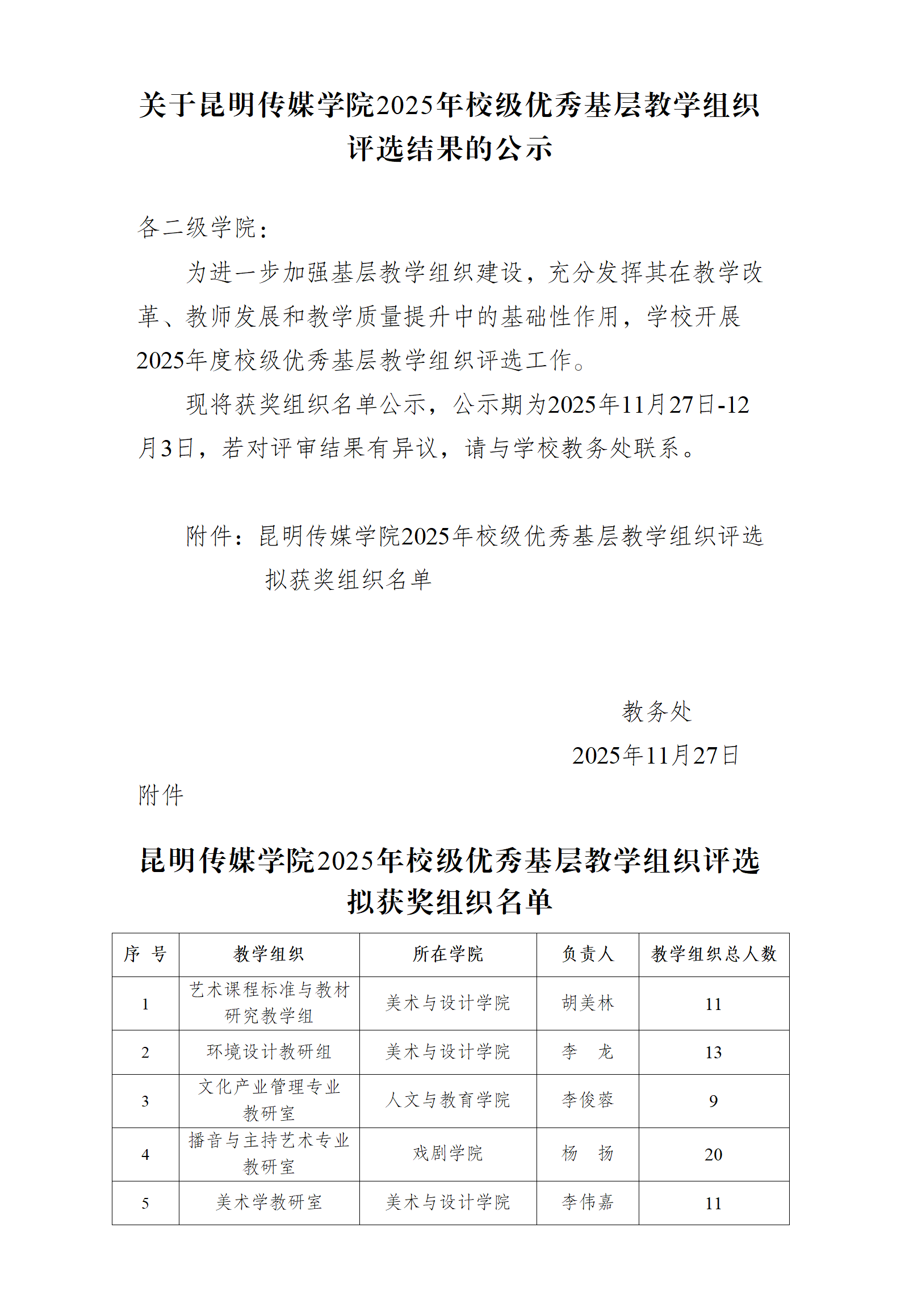 关于昆明传媒学院2025年校级优秀基层教学组织 评选结果的公示