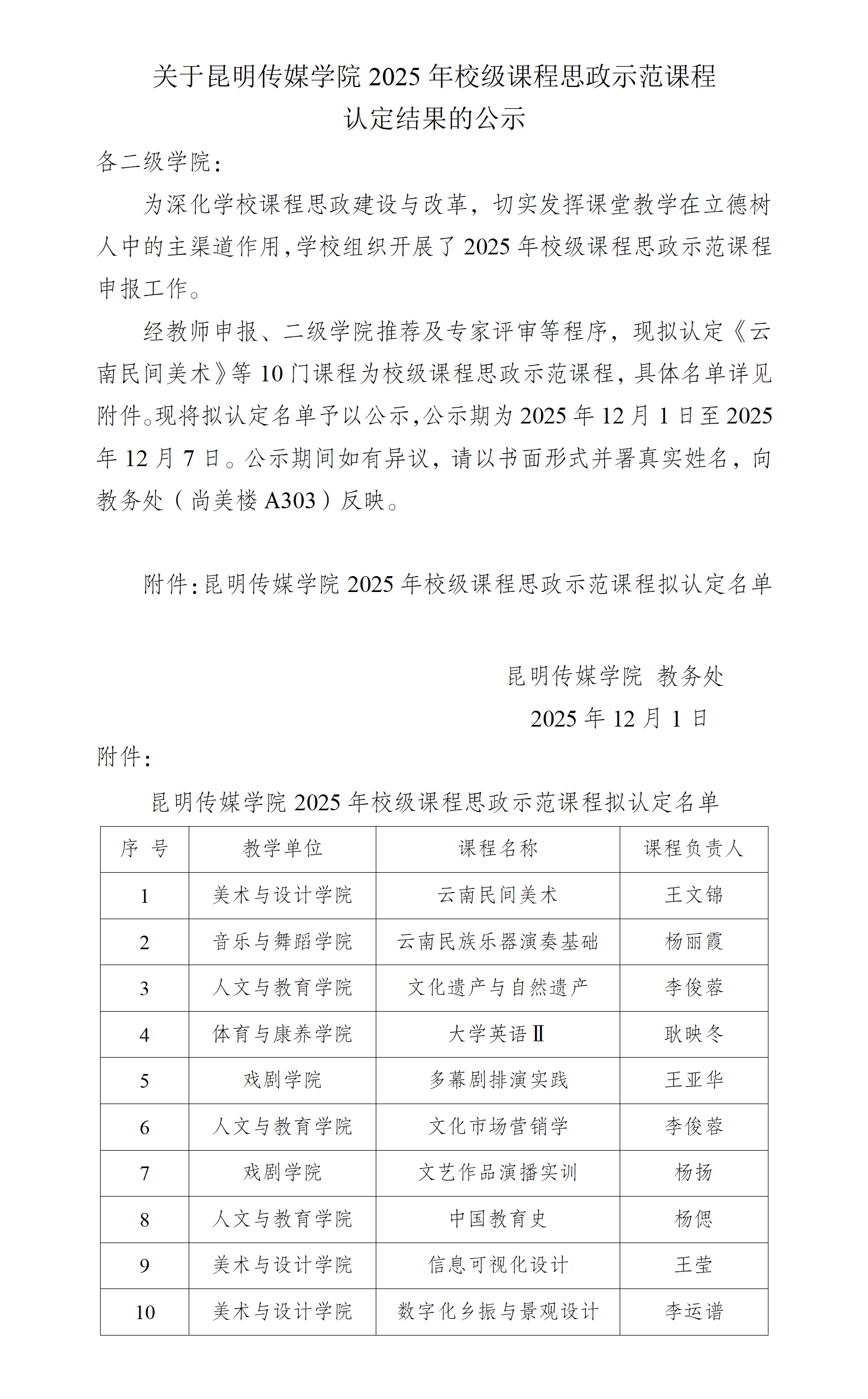 关于昆明传媒学院2025年校级课程思政示范课程认定结果的公示