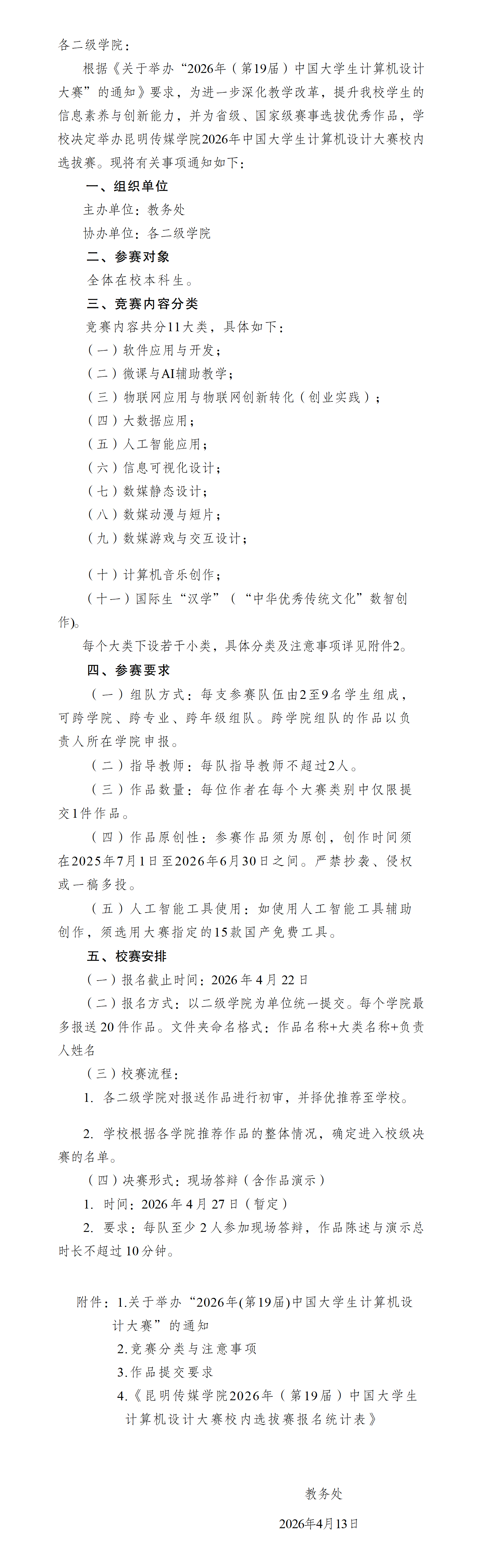 关于举办昆明传媒学院2026年(第19届)中国大学生计算机设计大赛校内选拔赛的通知
